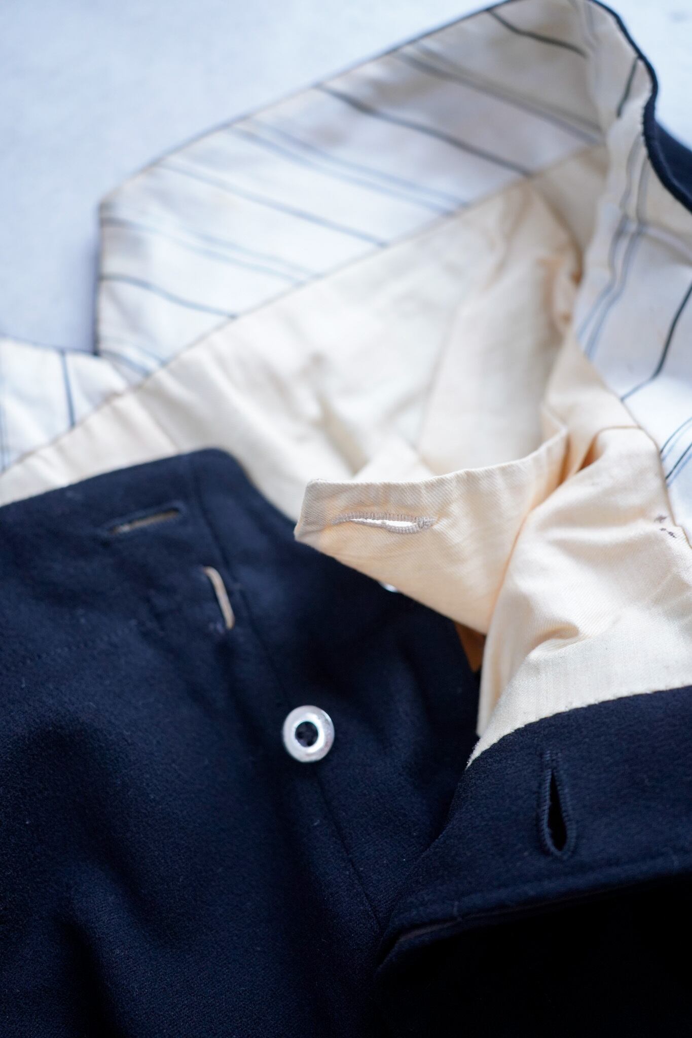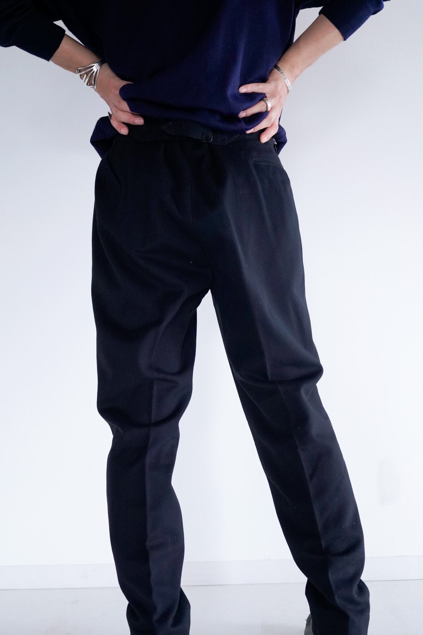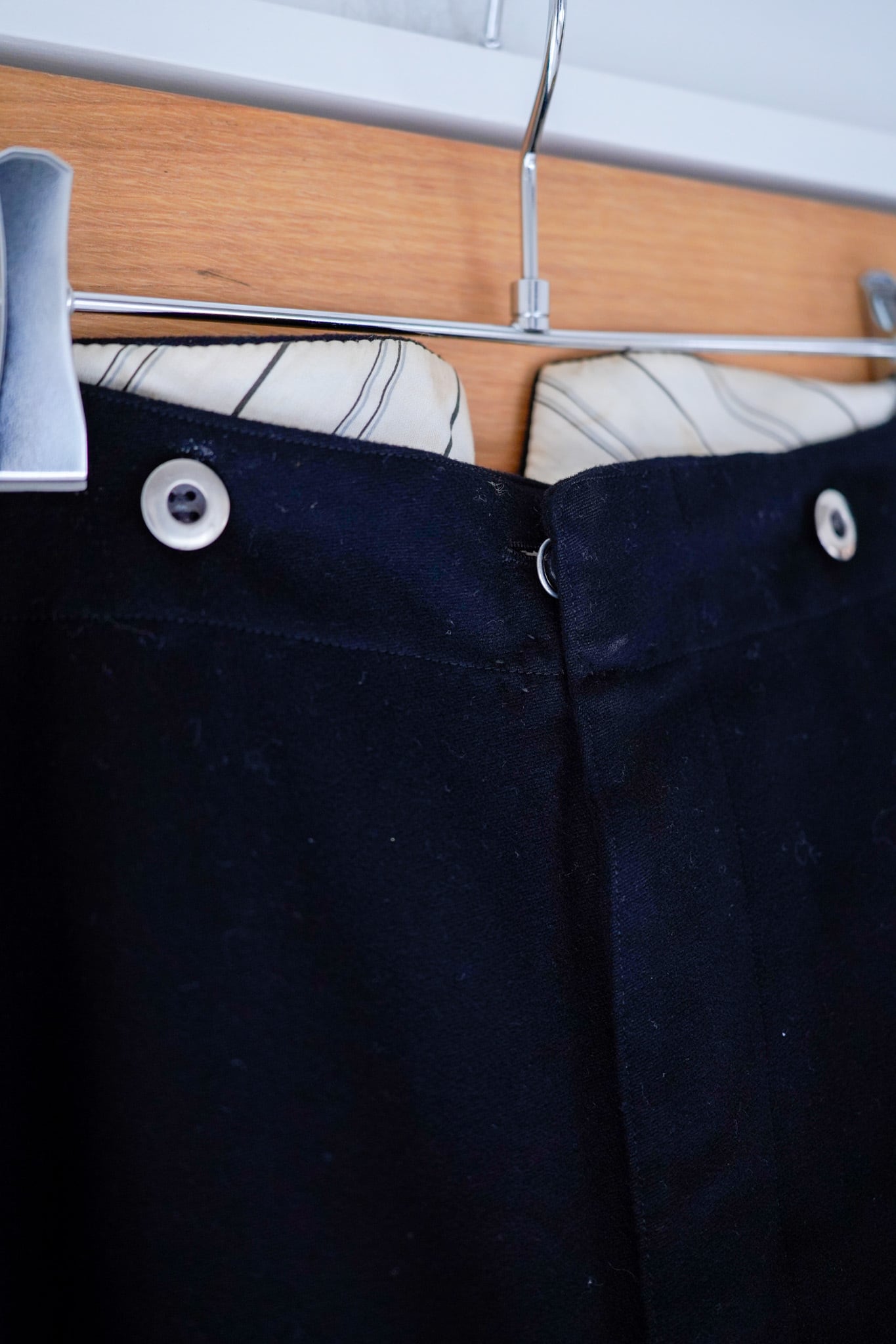 シンプルな黒一色のボトムスながら一眼で古いとわかる、ベルベットのような質感の肉厚なウール生地は圧巻です。