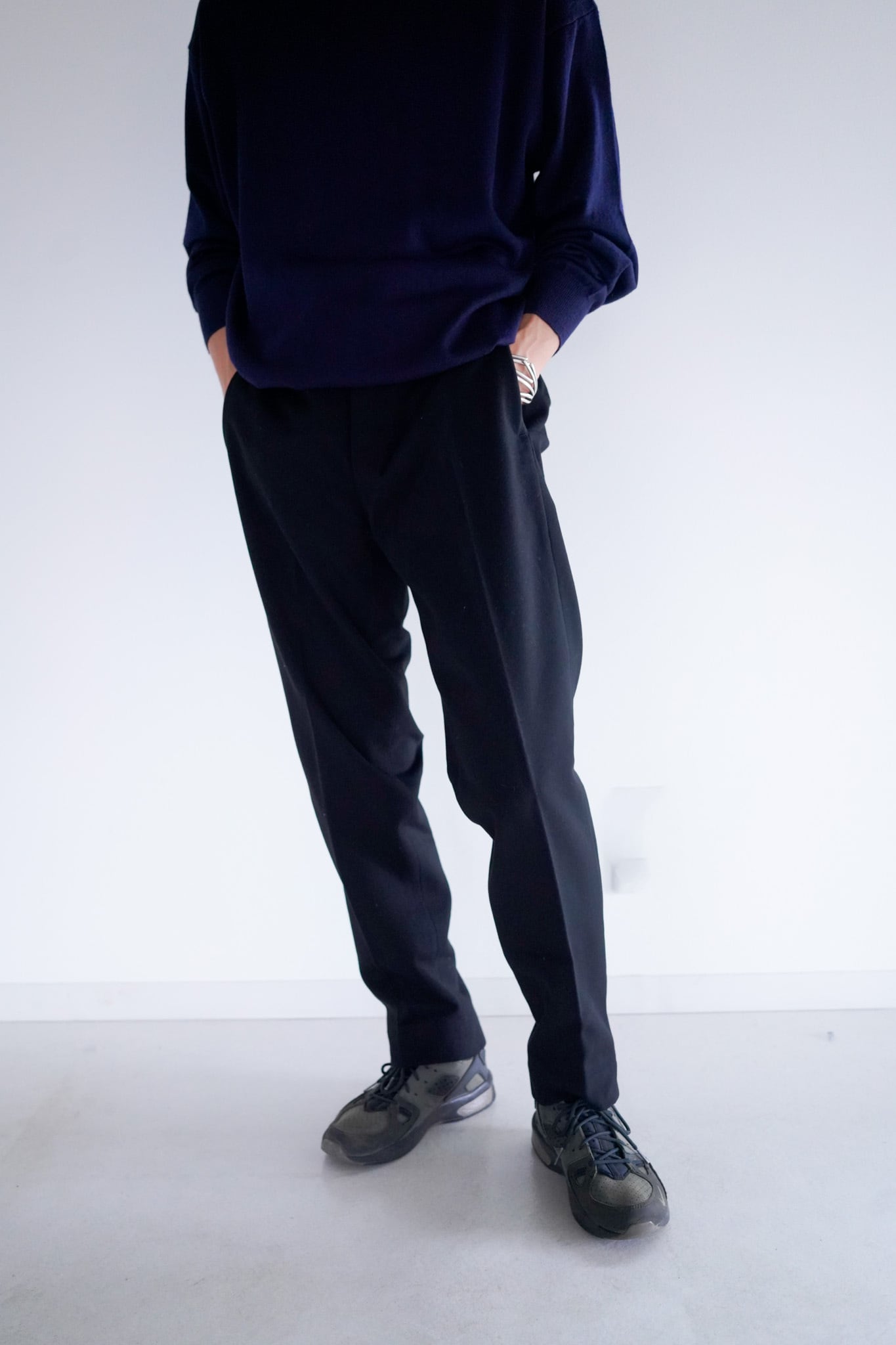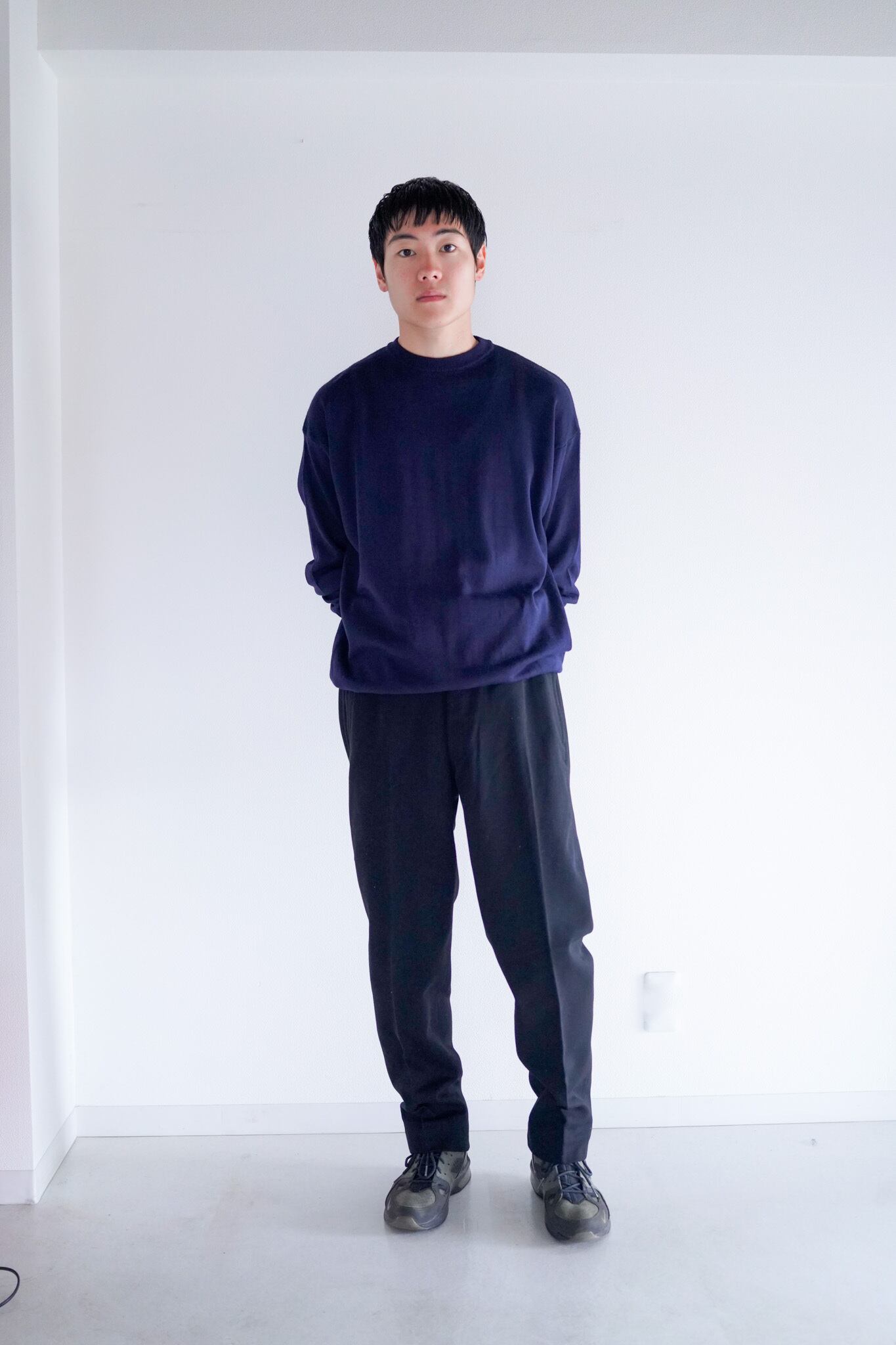 股上が深くお尻にたまるような生地のパターン、そこからテーパードかかるシルエットは古いパンツのファッションとしての可能性を感じます。