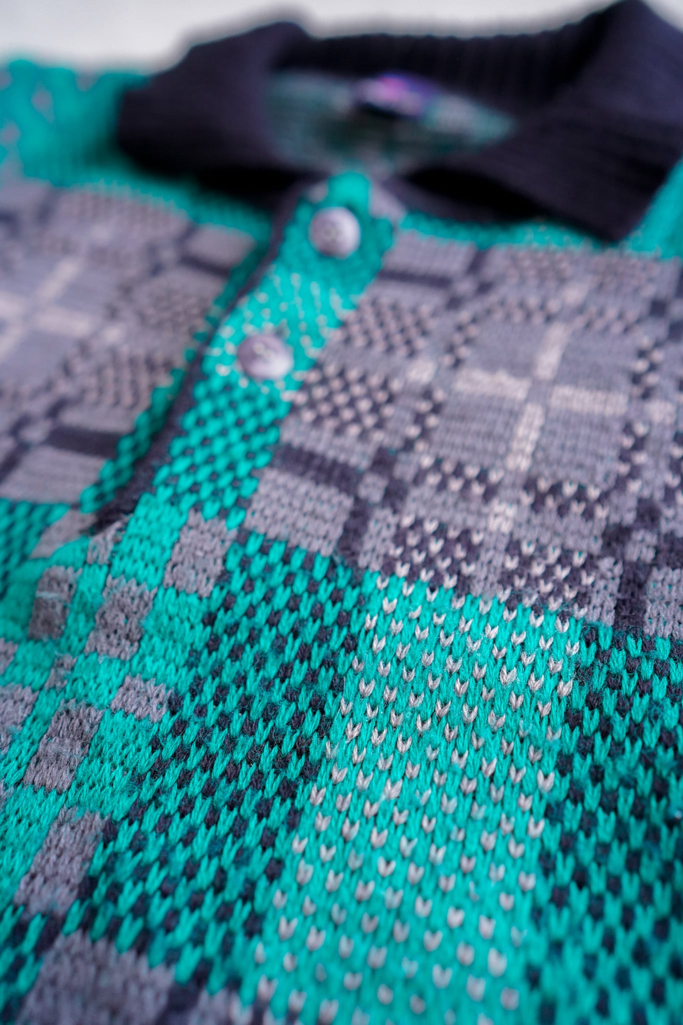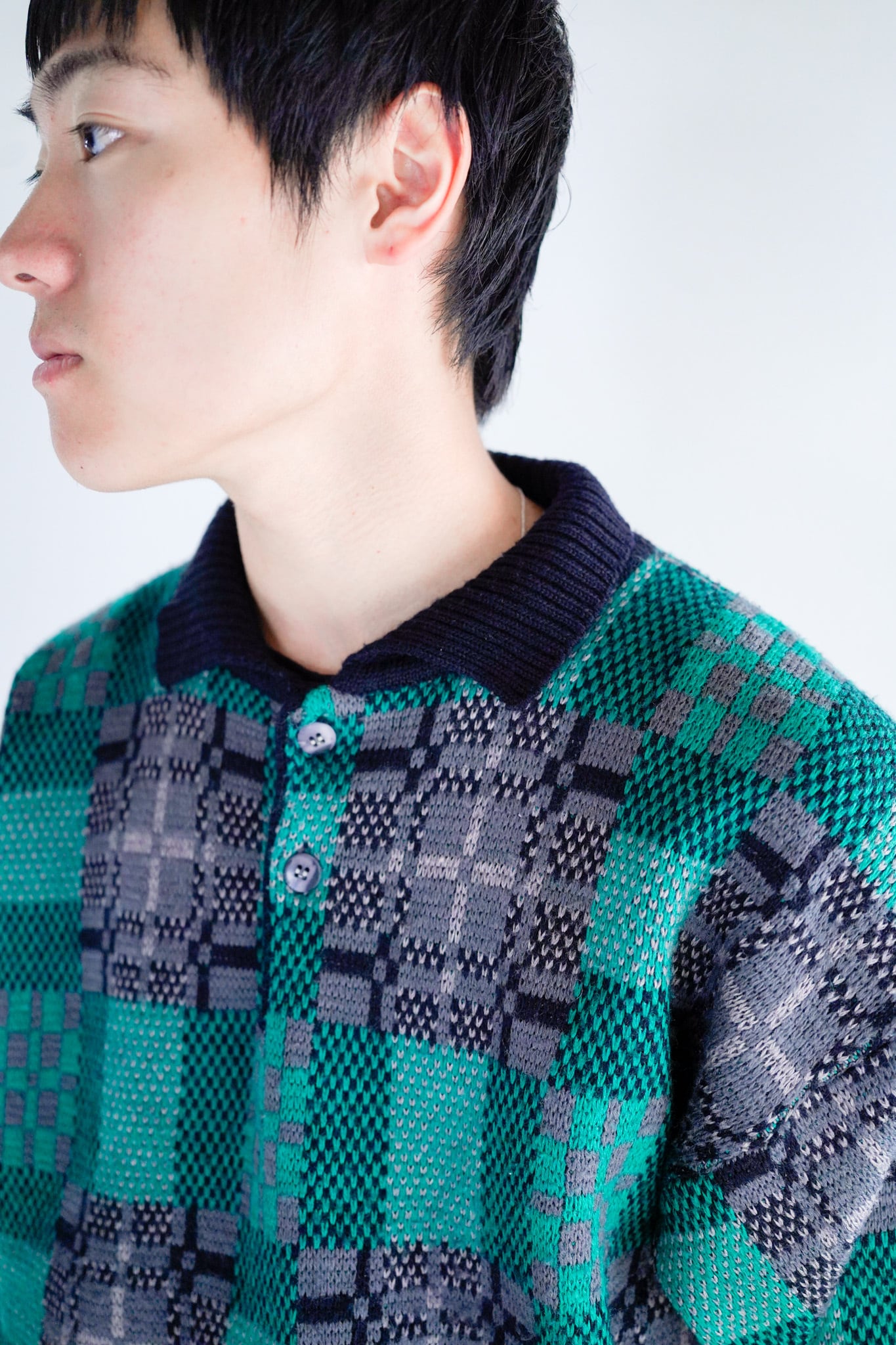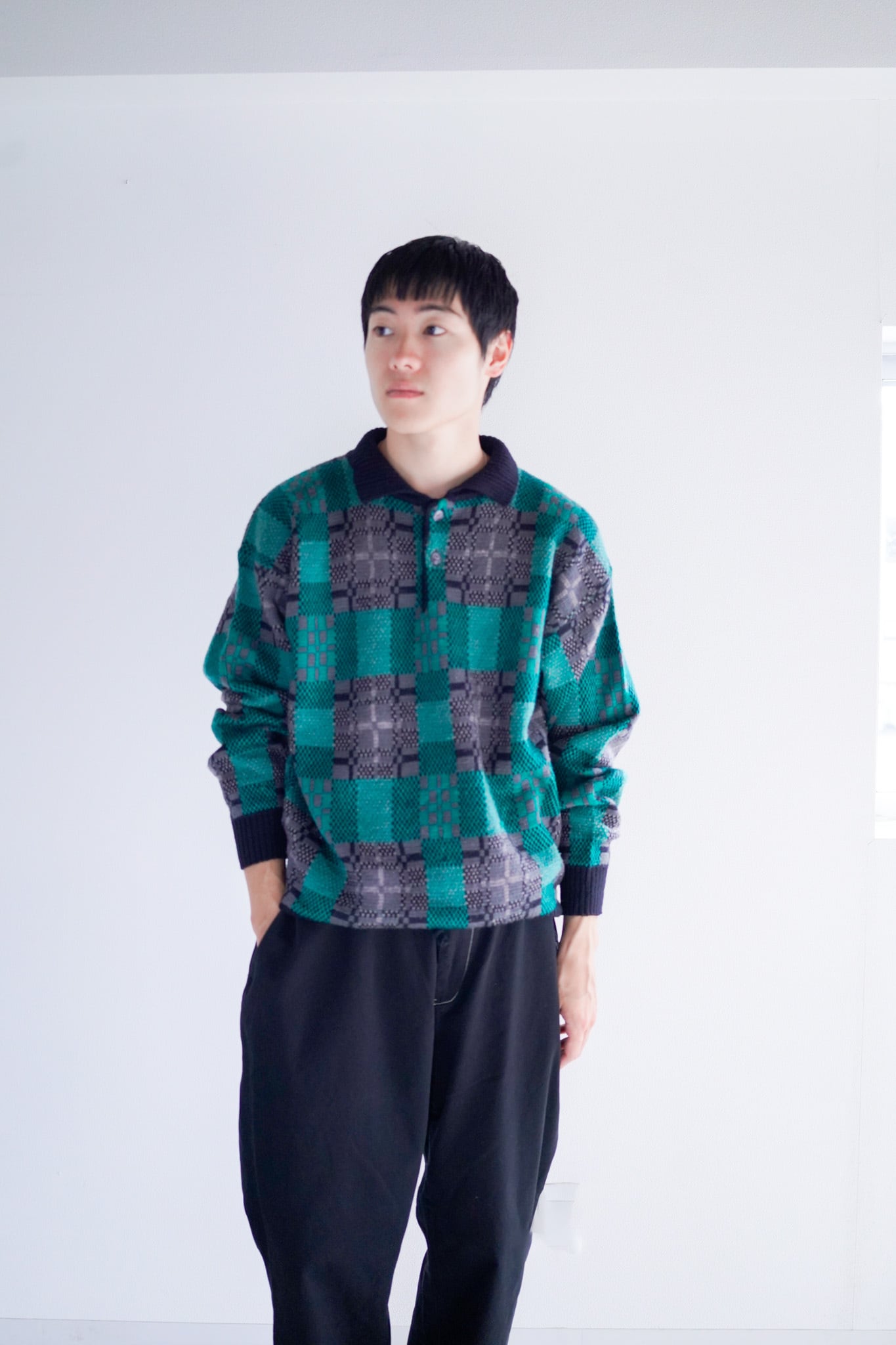 襟付きのポロスタイルに、織りで表現されたパターンが可愛らしい一着です。