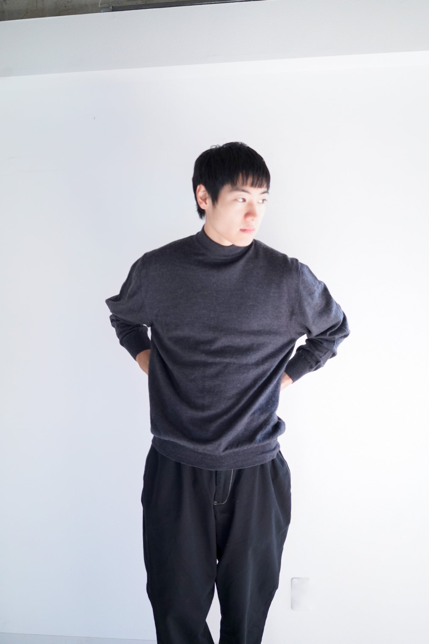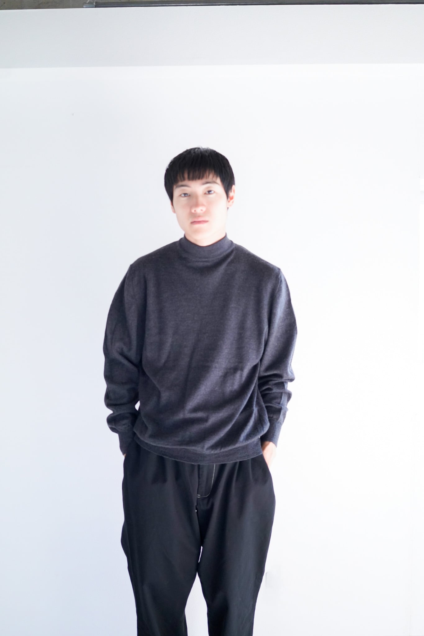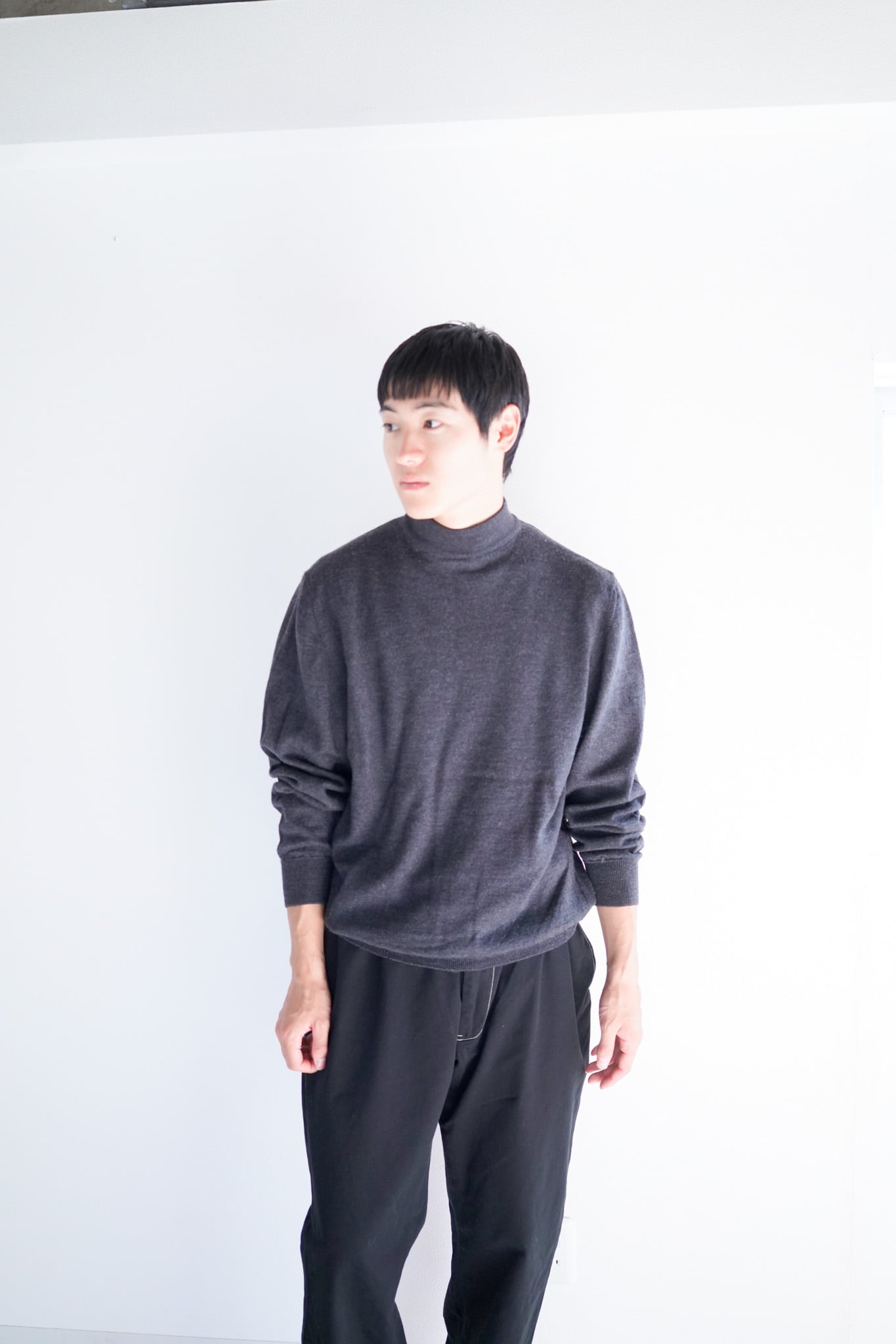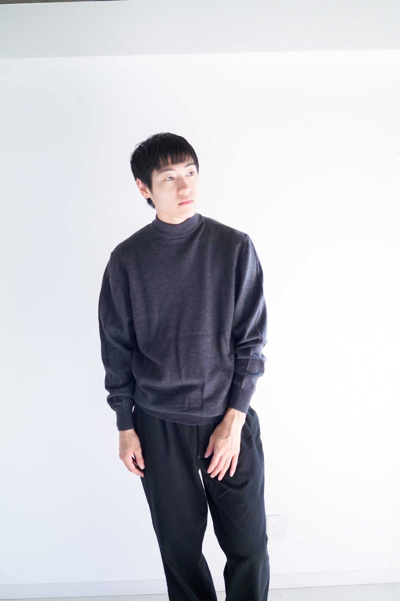 グレーカラーのモックネックとシンプルな一着だからこそ生地でお選びいただきたいアイテム。