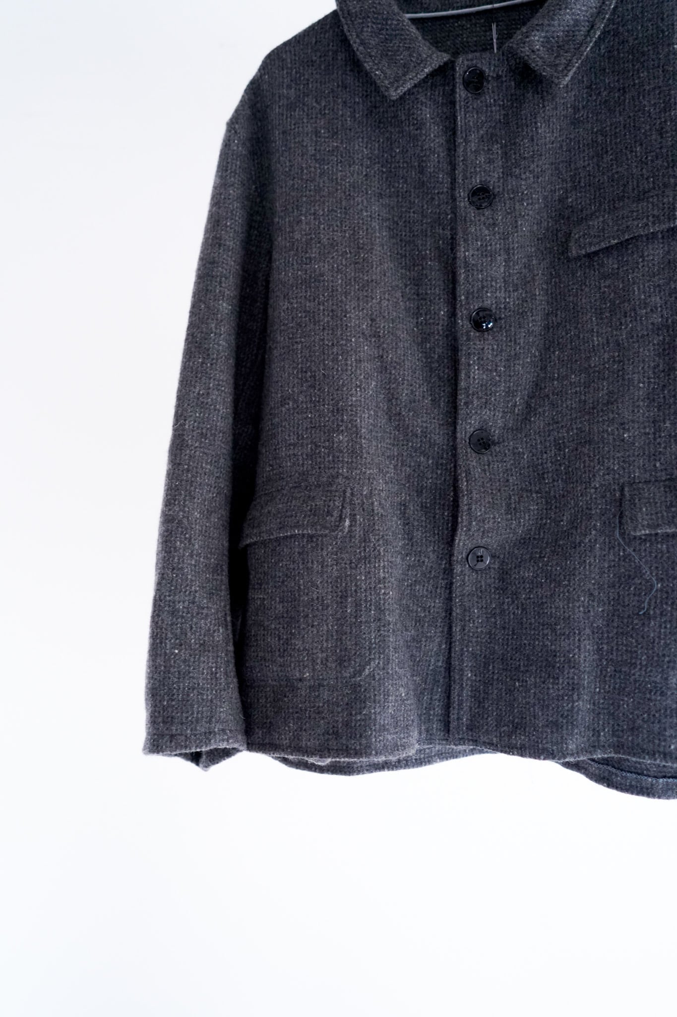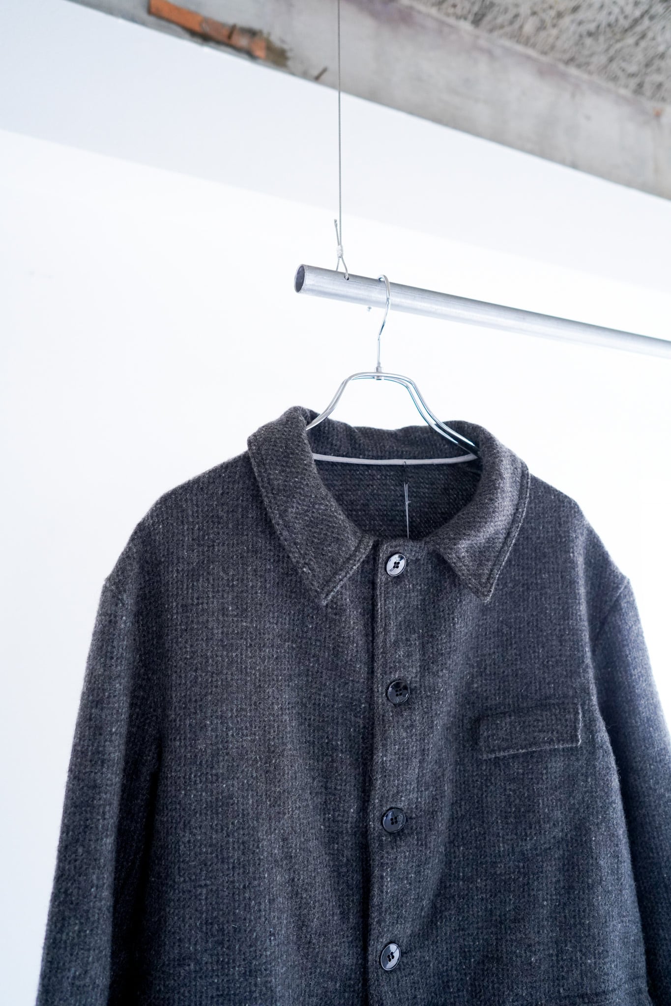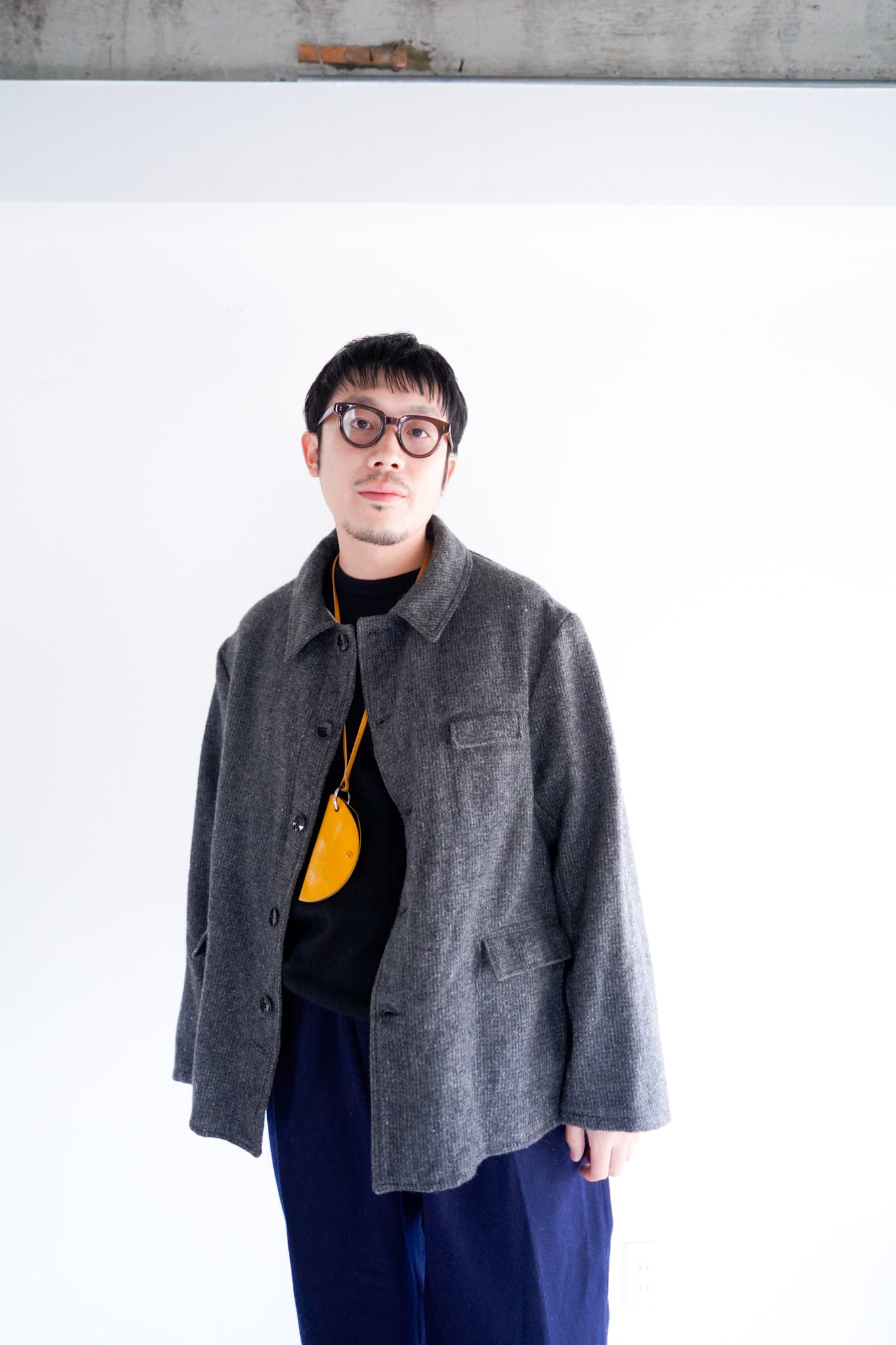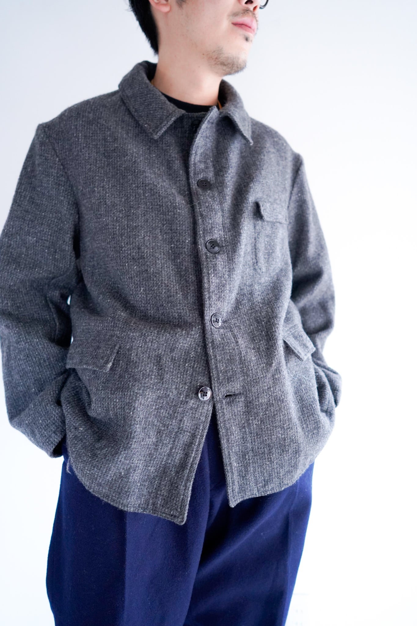 襟、ボタンとポケットの数・形など、フレンチワークジャケットにも似たディティールを備えてえおり、生地はフェルトのように優しくフワッとしたウール素材を使用しております。