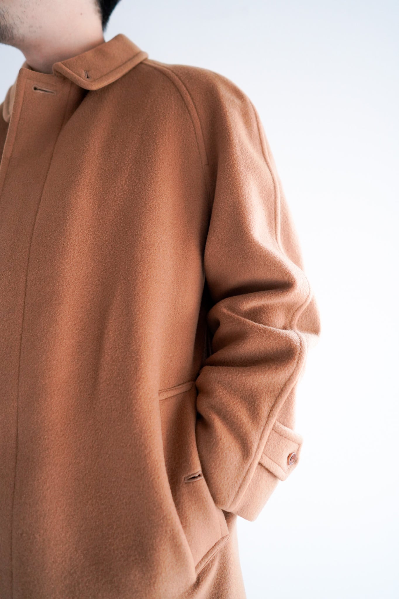 アームが広く採られなだらかに落ちるゆったりとしたサイジングも、生地の柔らかさがあるからこそのパターン。