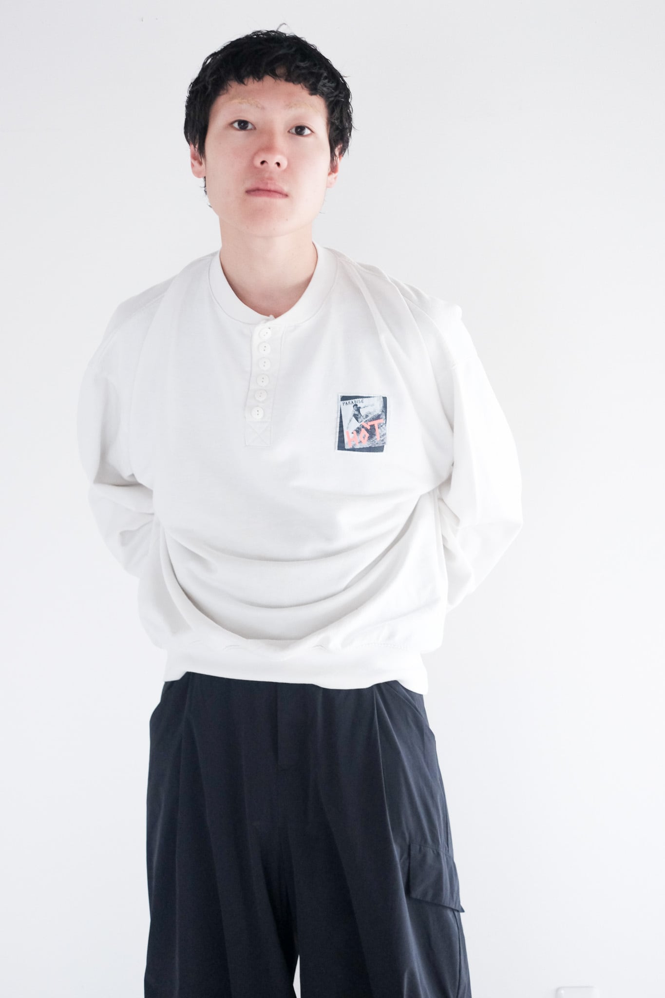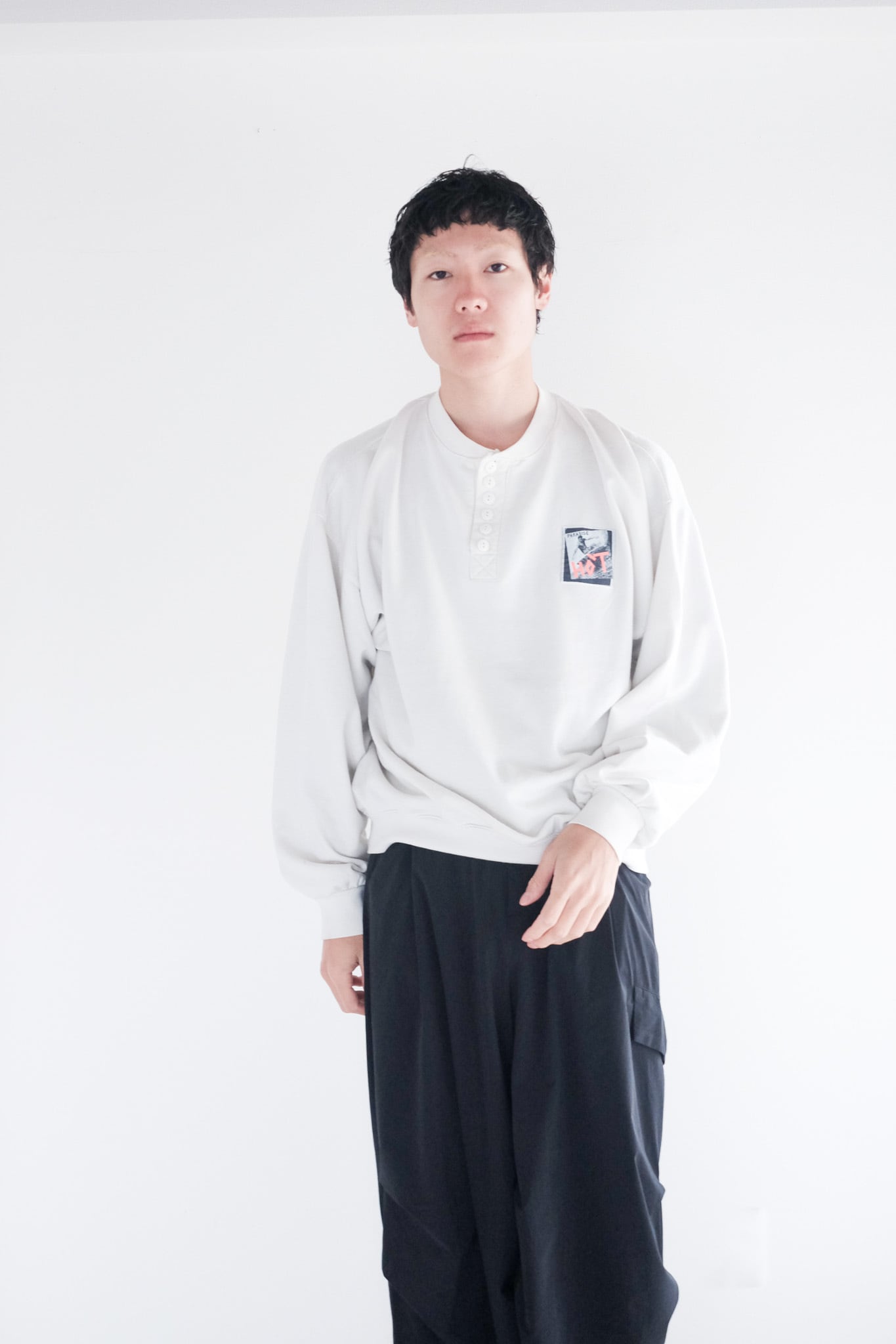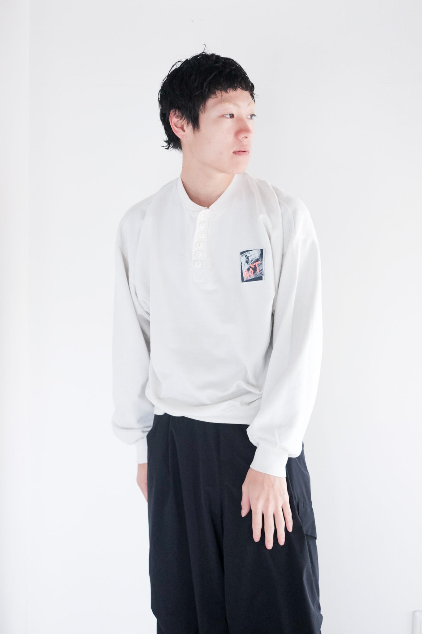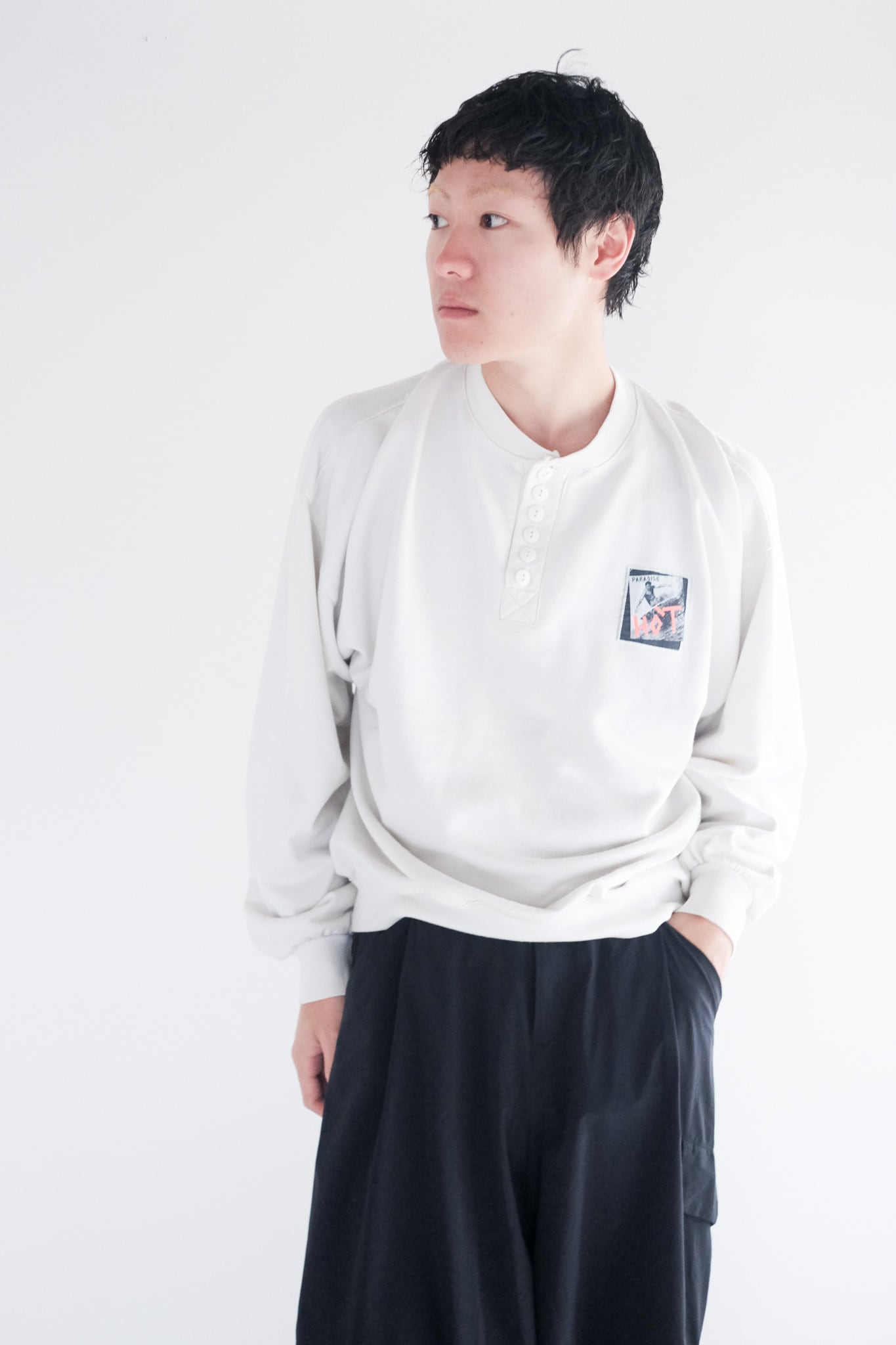 通常サーマルのようなジャストサイズの個体が多いヘンリーネックですが、スウェットらしいゆったりとしたサイジングでお召しいただけます。