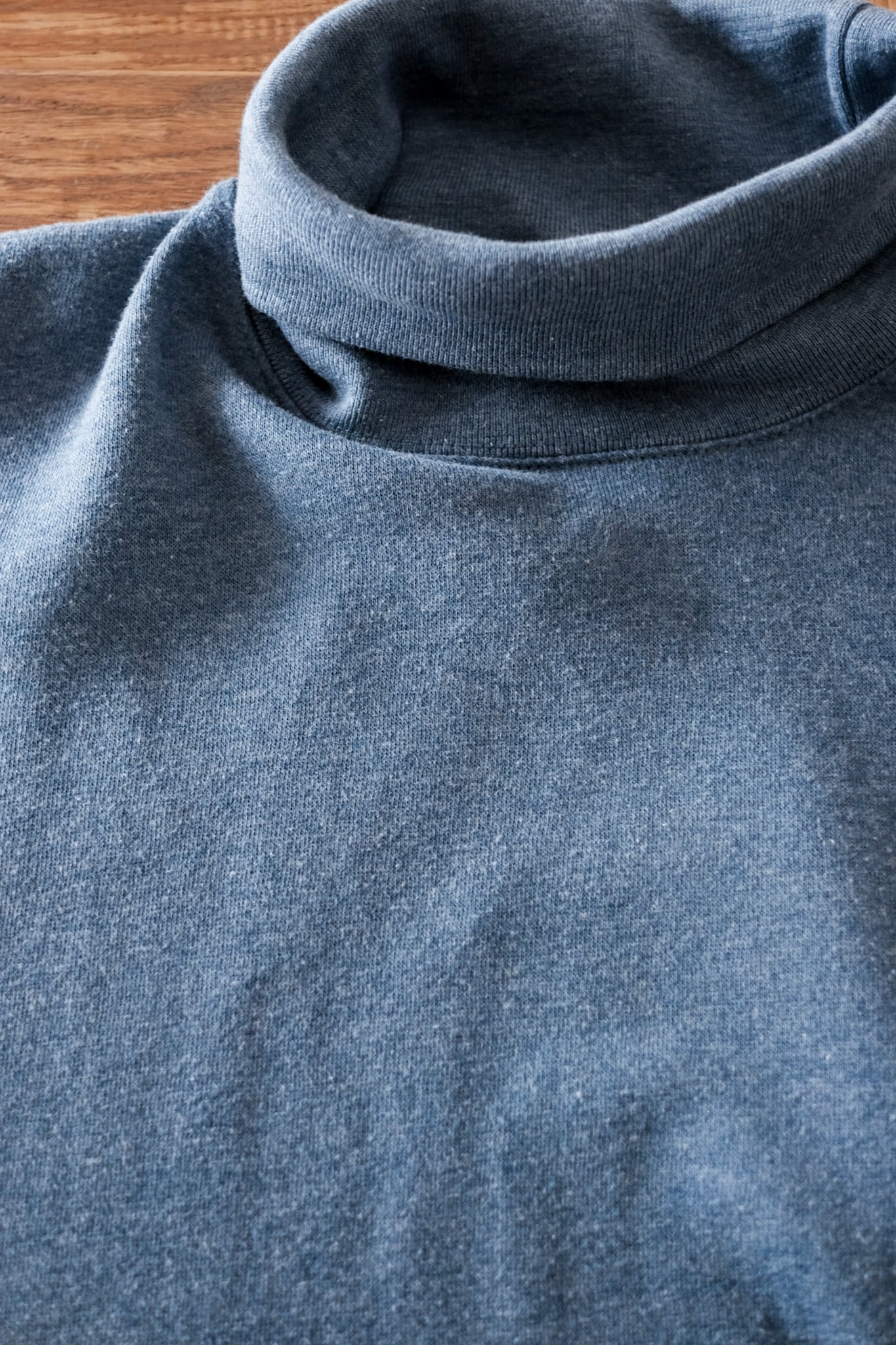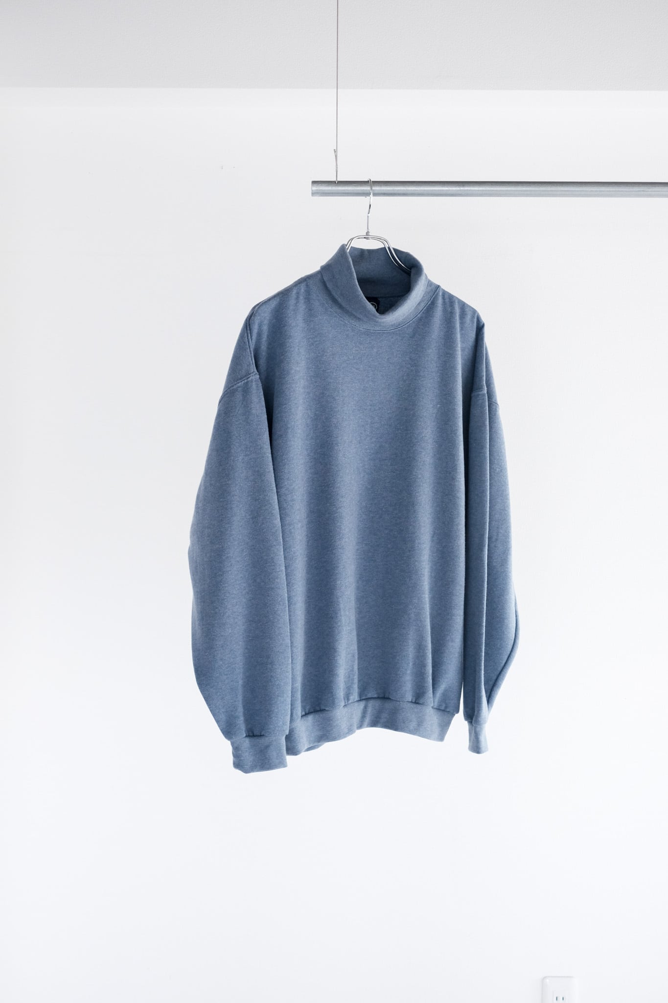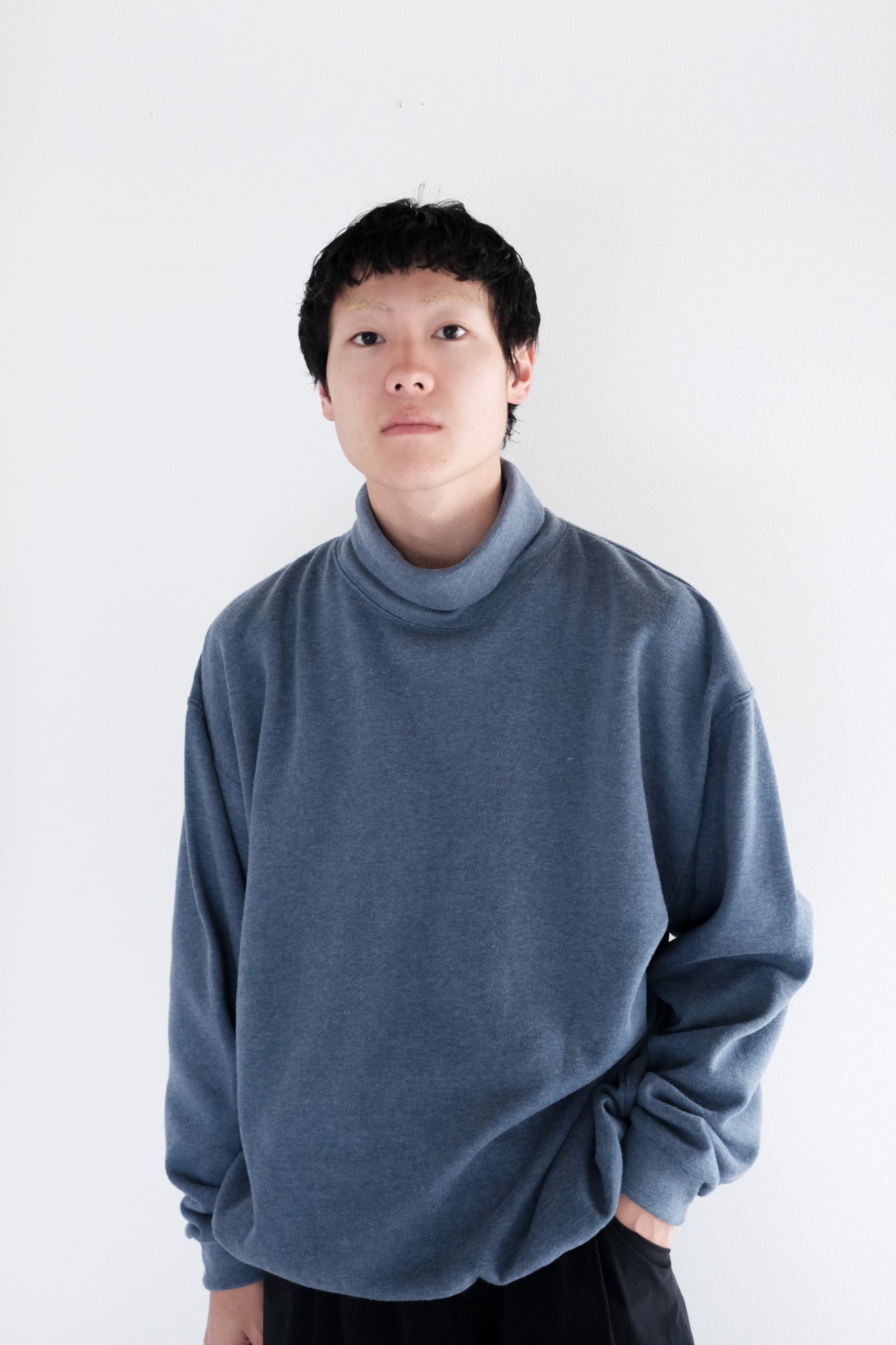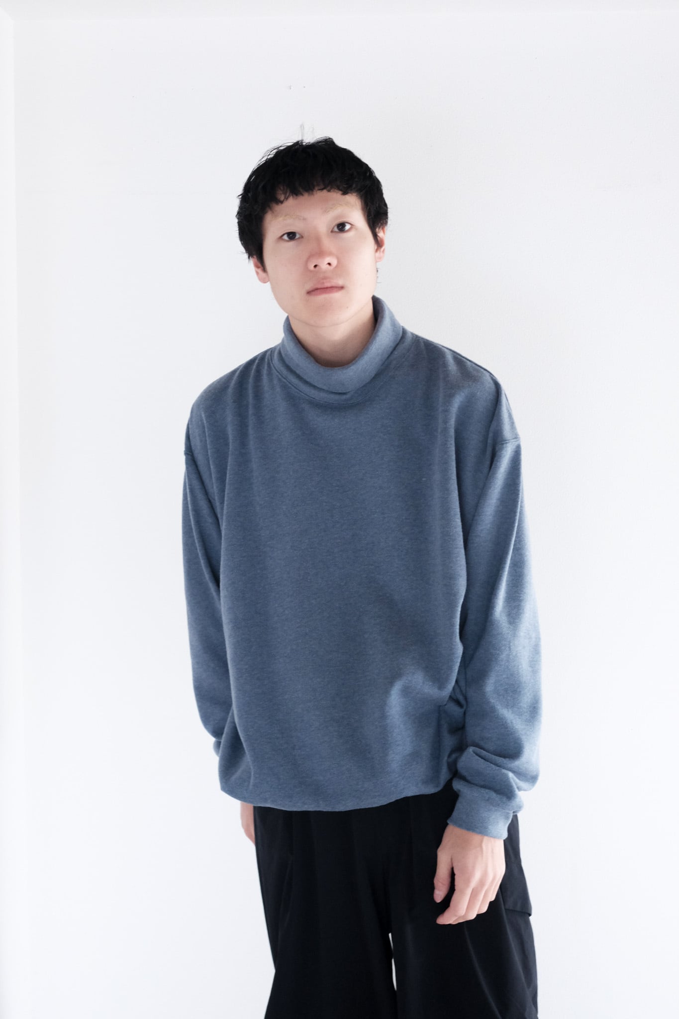 ゆったりとしたスウェットらしいサイジングのタートルネック。
