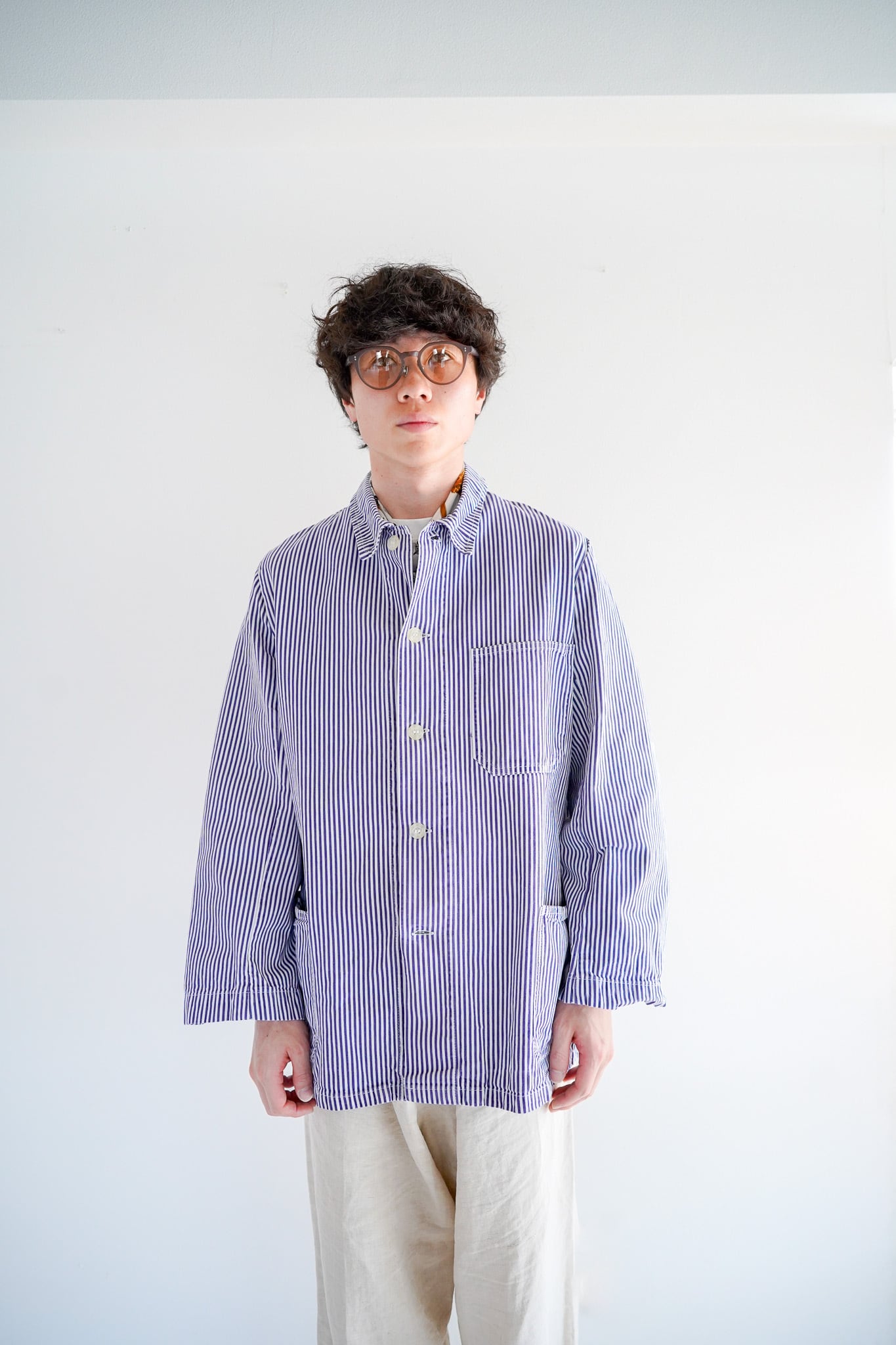 身幅にゆとりのあるボックスシルエットながら、着丈はすっきりとしており、現代的な着こなしにも自然に馴染みます。
